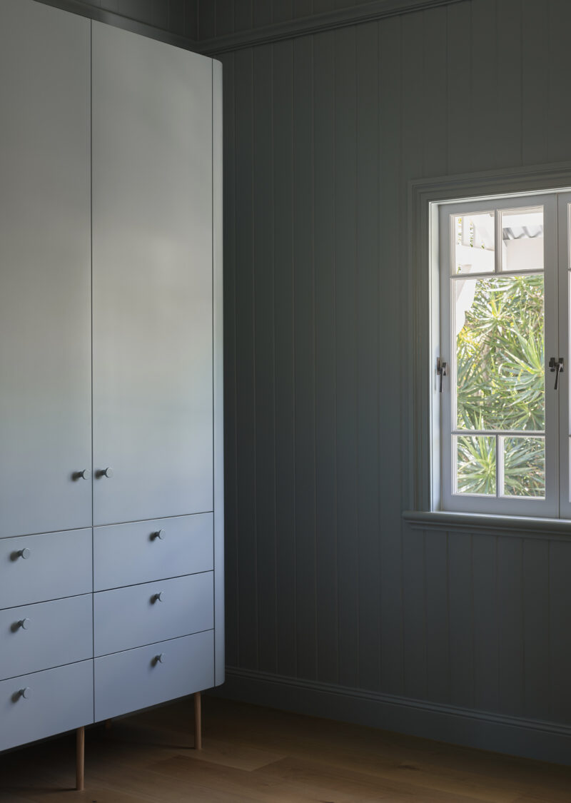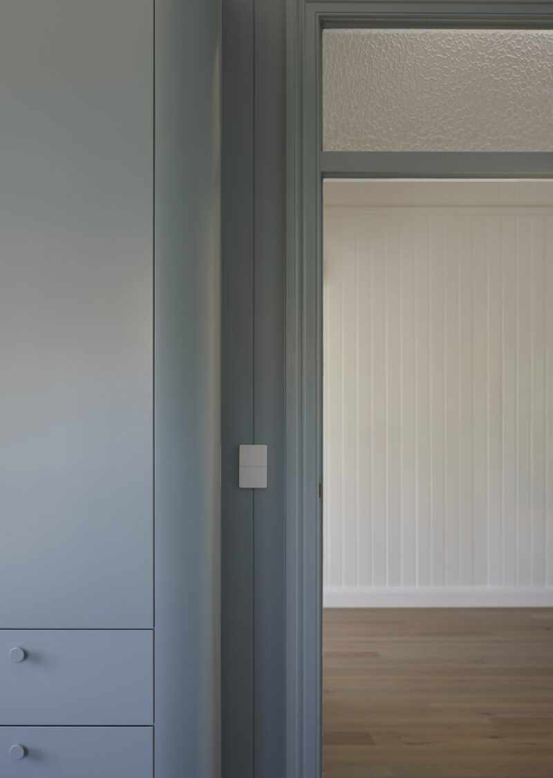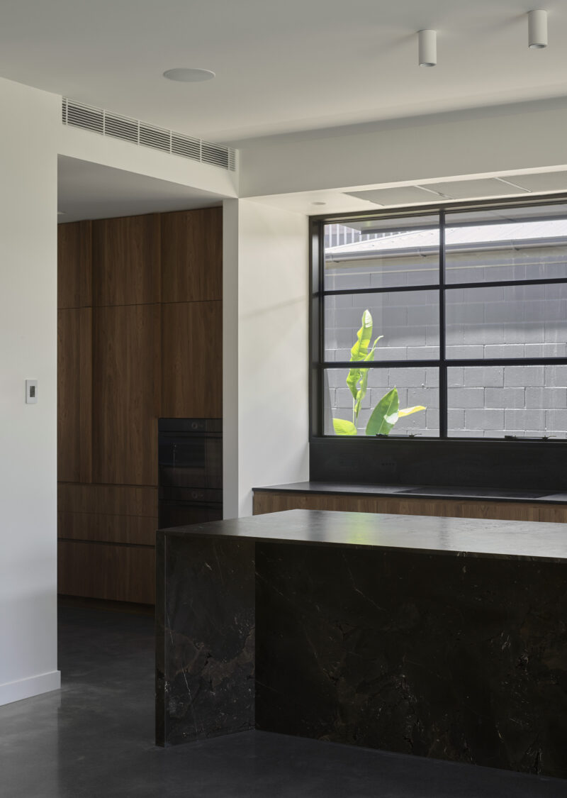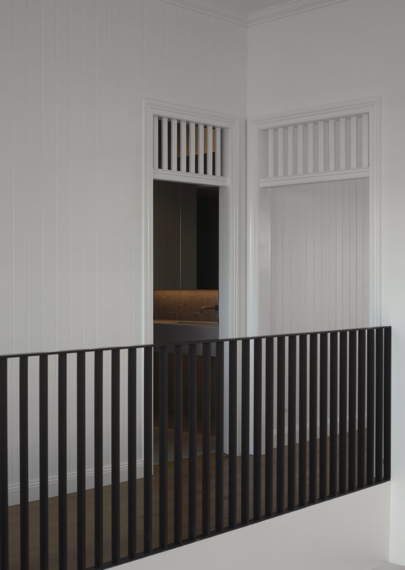 The traditional cladding was retained and the roof restored in zincalume, while new additions are crisp and modern in fibre cement with fine battens. Bold finishes add depth and texture while a dramatic central void brings light and air through the home, connecting bedrooms above with living spaces below, anchored by a sculptural concrete stair. The result is a generous yet intimate home designed for longevity and family life.