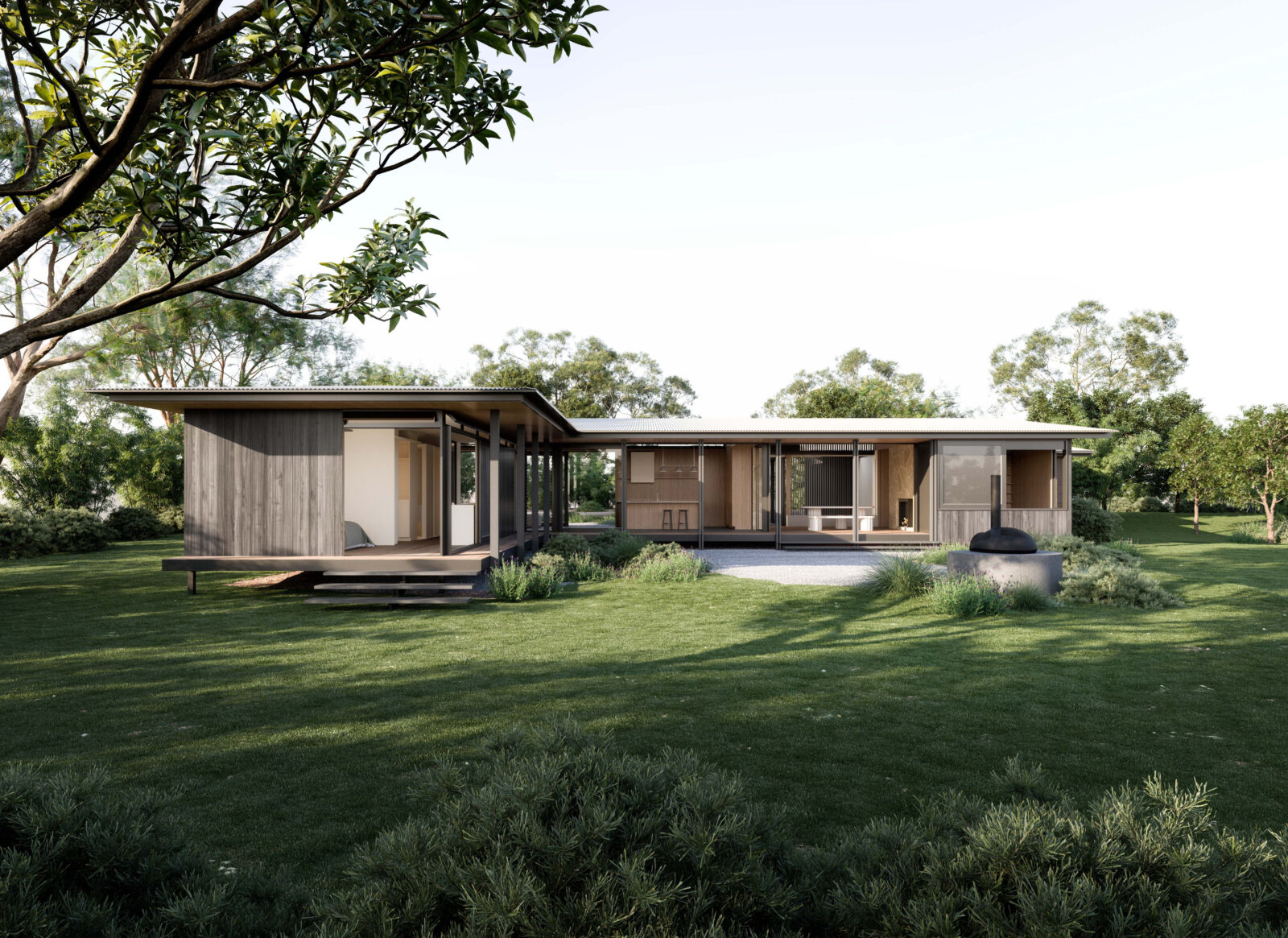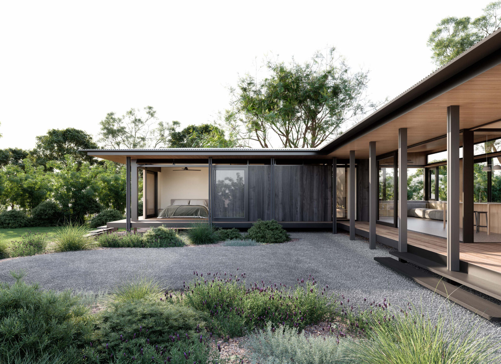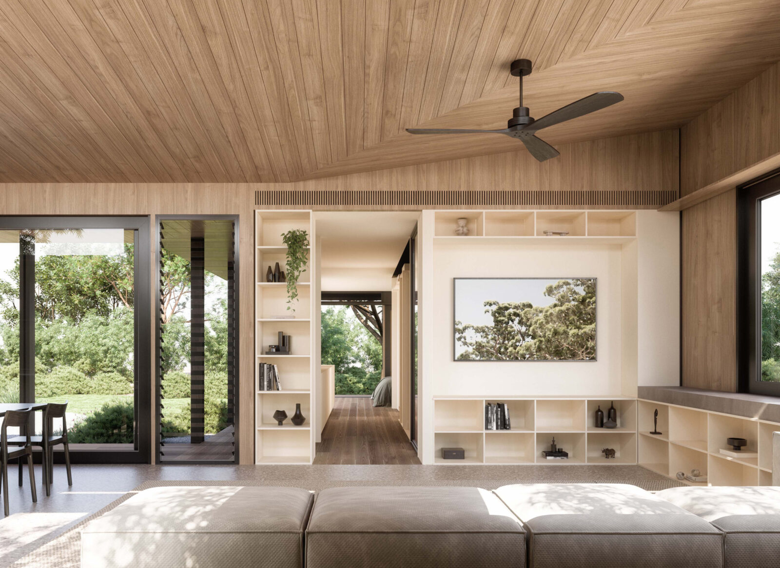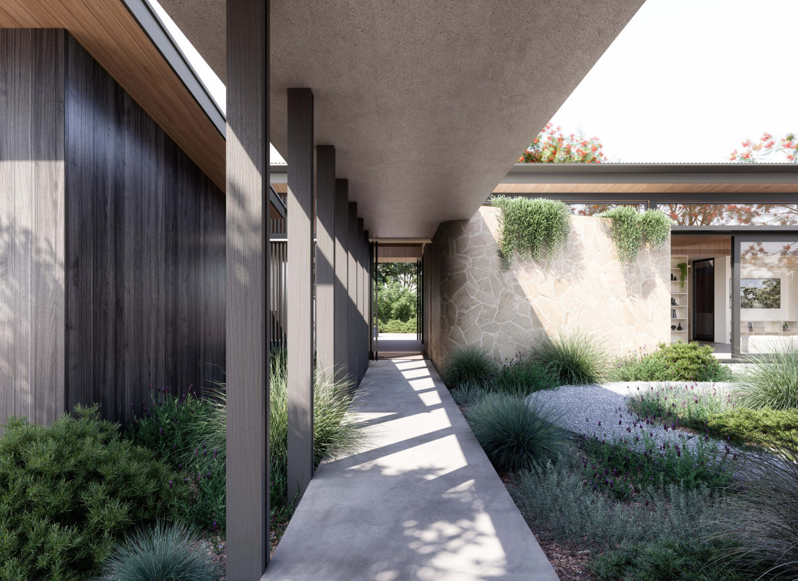 The home is arranged as a series of pavilions separated by verandahs that float just above the ground, creating clear transitions between inside and out. A disciplined architectural grid provides structure to plan and movement, forming north- and south-facing courtyards that allow the garden to interrupt the grid and shape the experience of the house. The project is as much landscape as architecture, balancing modest scale with a commitment to durable, tactile materials chosen for their longevity and use. Exposed timbers, concrete detailing and deep overhangs express the logic of building while softening the overall form.
