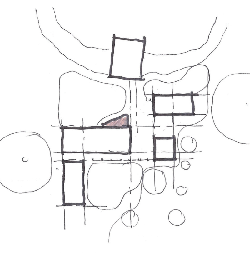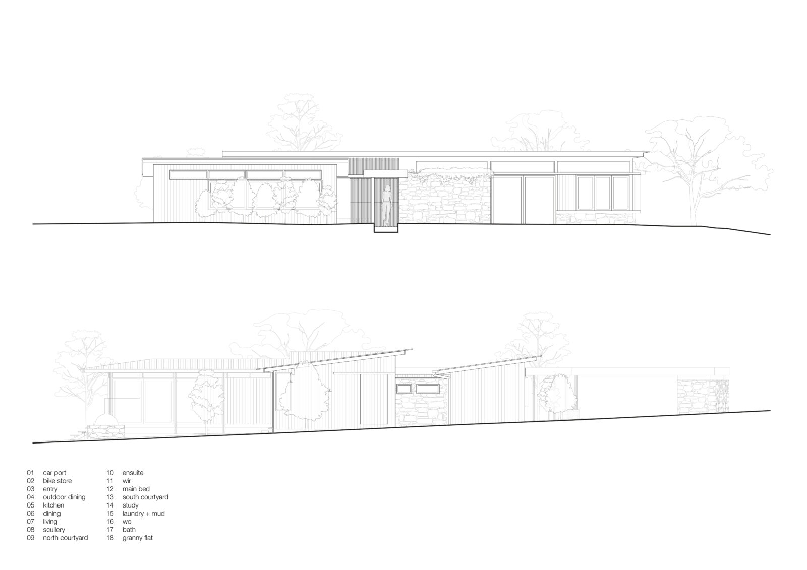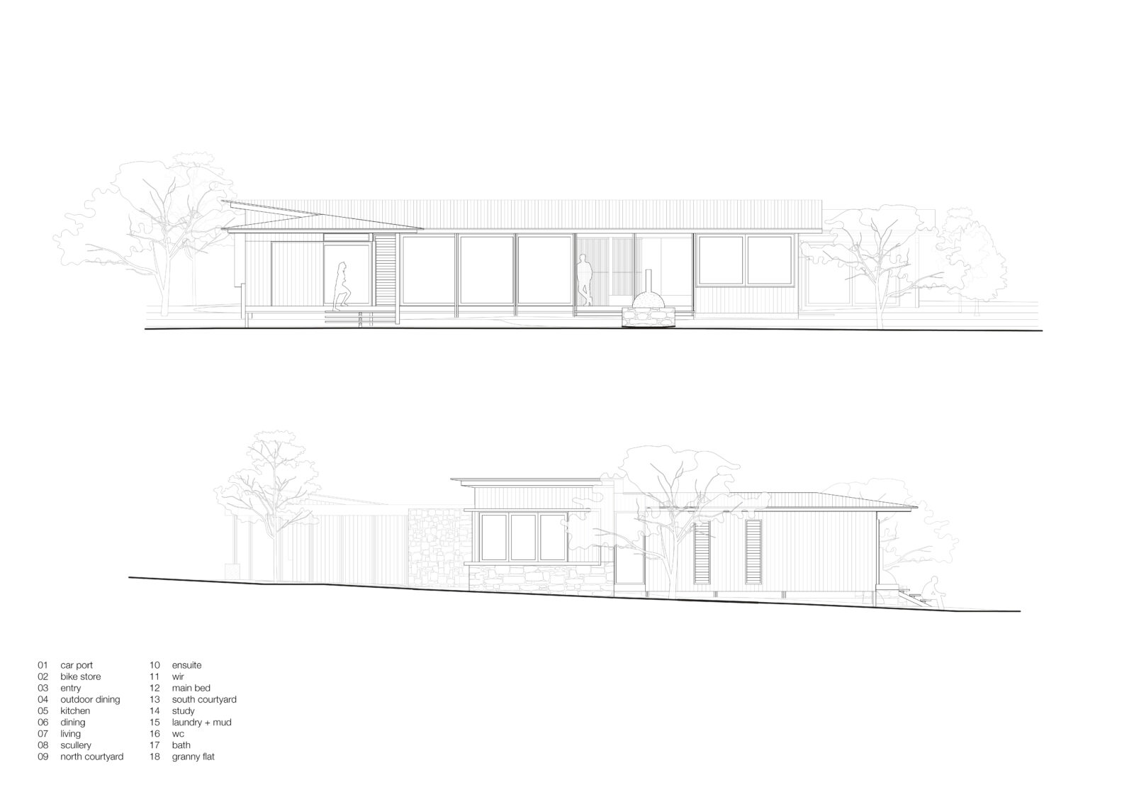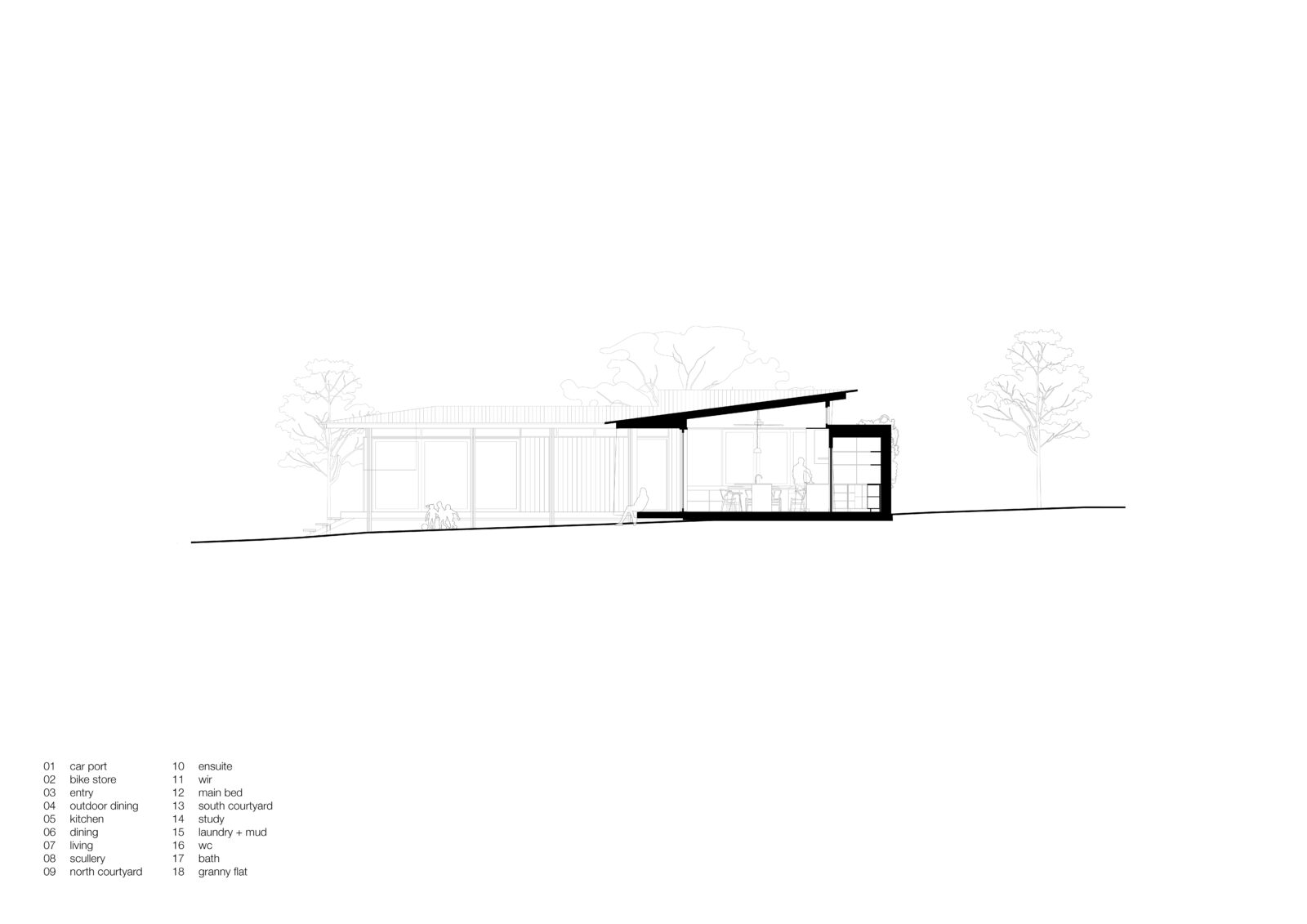 The home is arranged as a series of pavilions separated by verandahs that float just above the ground, creating clear transitions between inside and out. A disciplined architectural grid provides structure to plan and movement, forming north- and south-facing courtyards that allow the garden to interrupt the grid and shape the experience of the house. The project is as much landscape as architecture, balancing modest scale with a commitment to durable, tactile materials chosen for their longevity and use. Exposed timbers, concrete detailing and deep overhangs express the logic of building while softening the overall form.