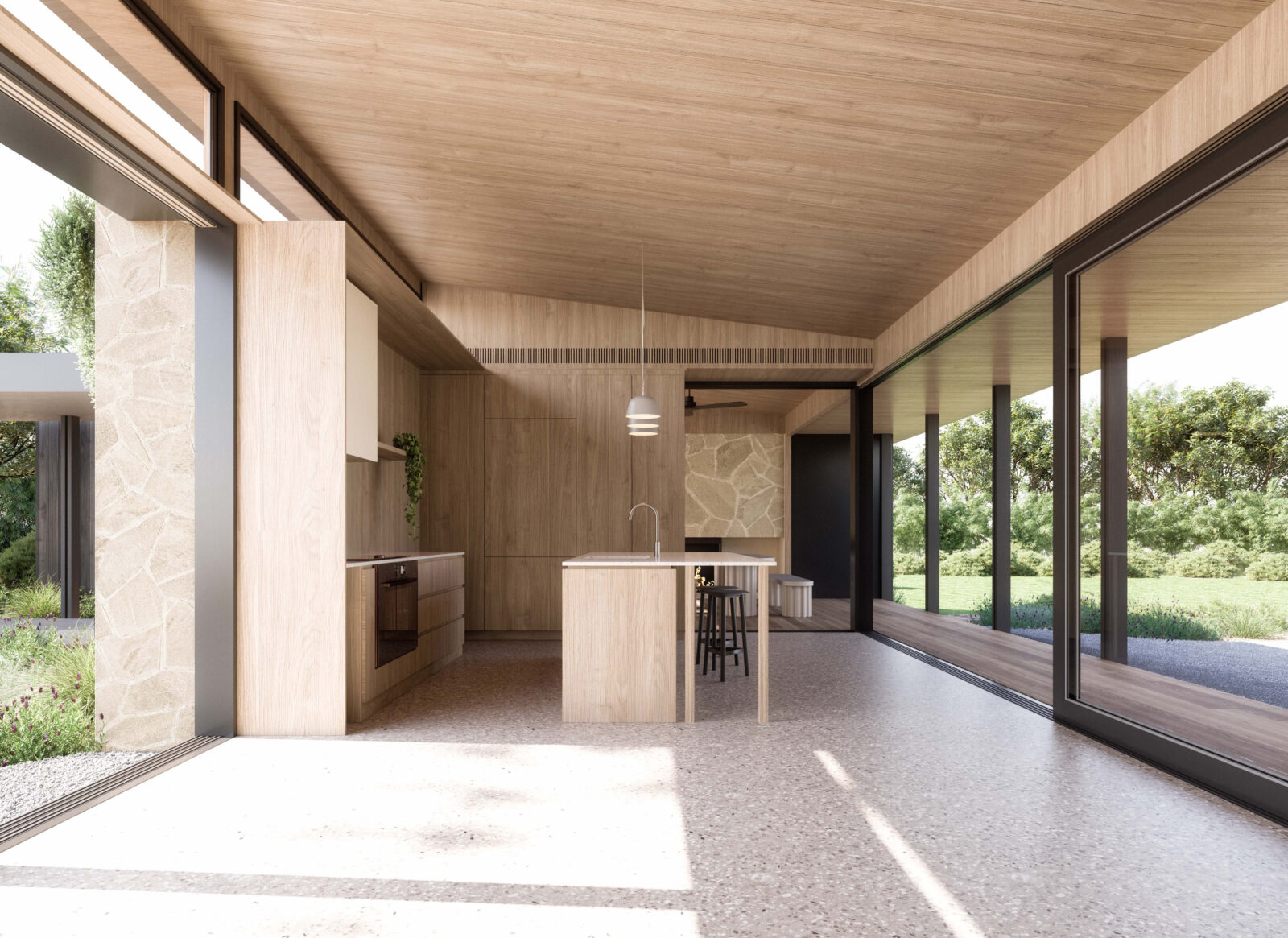 Interior spaces are warm, flexible and well proportioned. They are comfortable for two yet capable of expanding to accommodate visiting children, friends staying over and informal gatherings, from family meals to Friday afternoon drinks with the Petro Builders team. Water, breeze and shade are considered as part of the overall site strategy, with overland flow directed through the landscape to support planting, seasonal change and resilience. Designed with future generations in mind, the house is conceived as a long-term contribution to the site, grounded in clarity, generosity and custodianship.