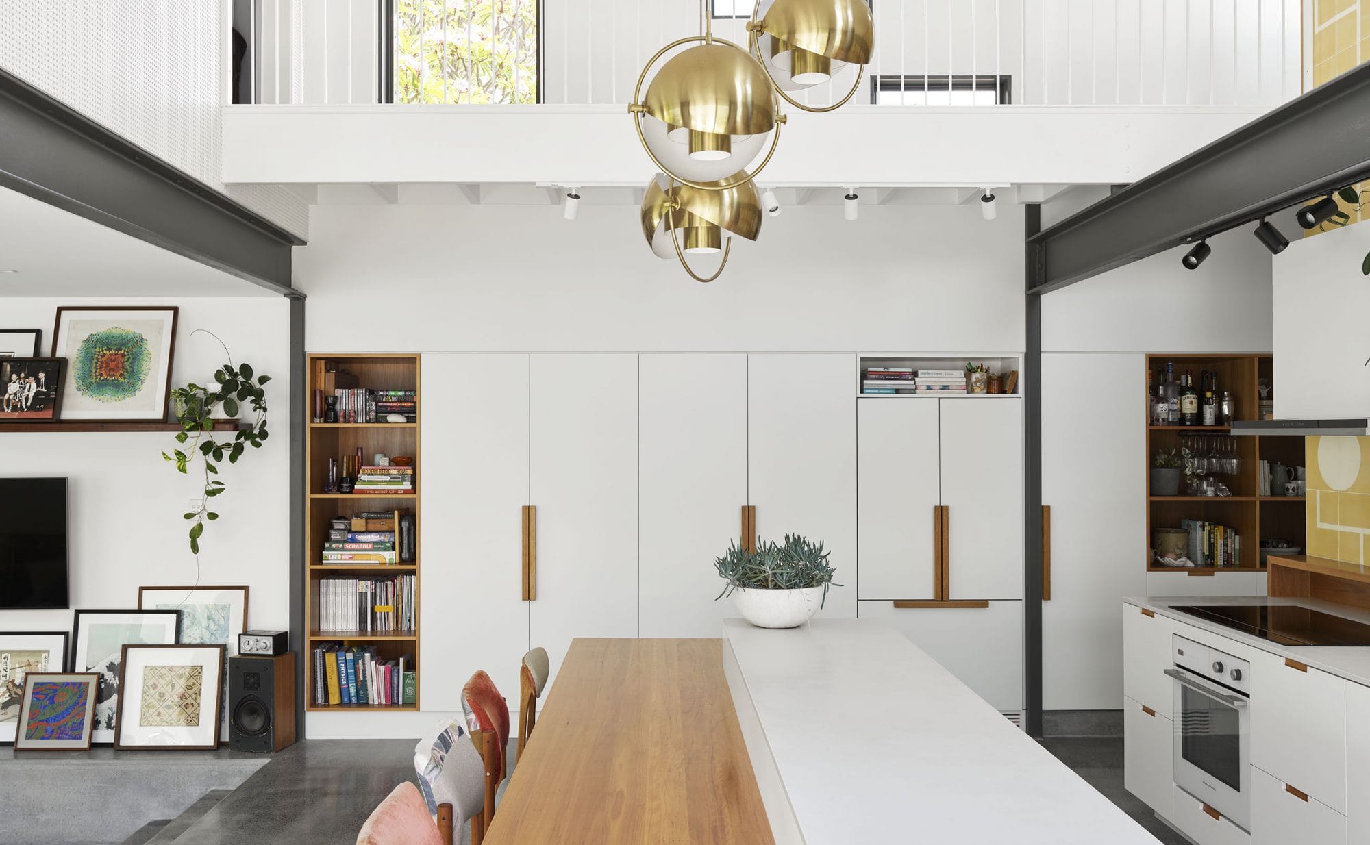 By utilising a side front entry and split-level living, we were able to add amenity without needlessly encroaching on the backyard. The restored cottage now houses the boys’ bedrooms and a rumpus, with a fifth bedroom, laundry and bathroom underneath. An adjoining extension introduces an additional living level to the home that sits halfway between the street level of the cottage and the boys’ wing upstairs. This double-height extension houses a kitchen and sunken lounge that connect with garden, as well an upstairs master bedroom and ensuite (known as Rachel’s ‘isolation zone’). We positioned the master directly above the sunken lounge to enclose this space and create a sense of cosiness against the double-height void and adjoining garden.